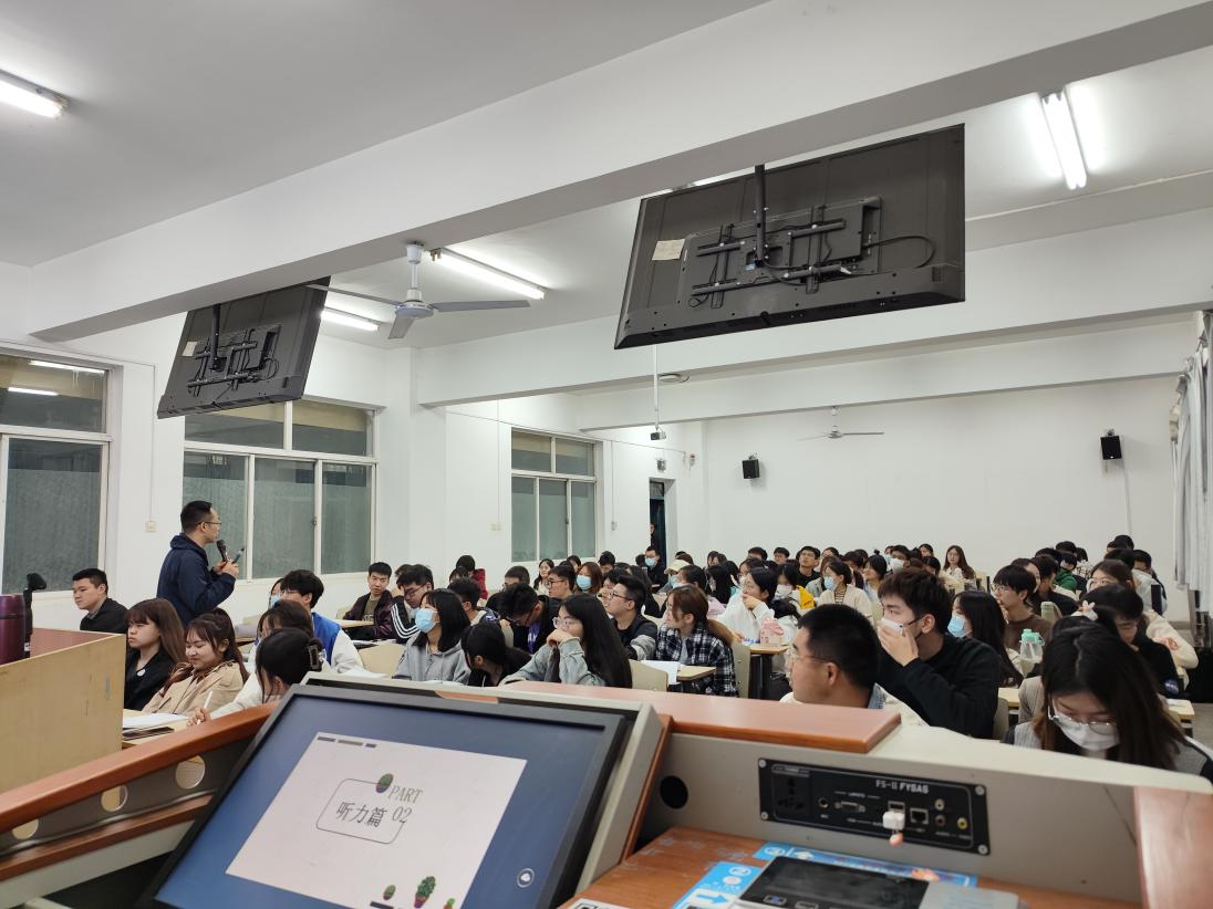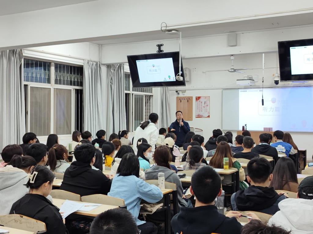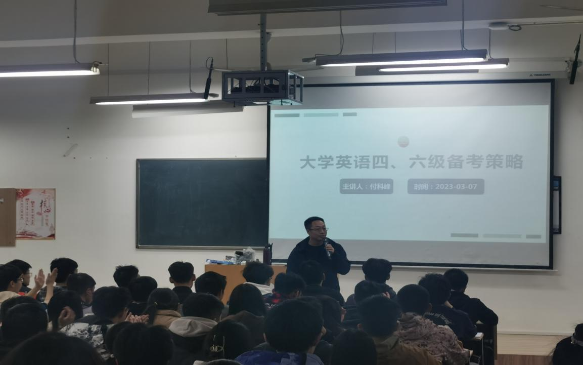 3月8日晚,2026年国际足联世界杯举办了英语学习规划讲座暨四六级考试动员大会,外语培训中心主任付科峰应邀作了题为“大学英语四、六级备考策略”的专题讲座。全校近600余名员工参与聆听,讲座取得了很好的反响。