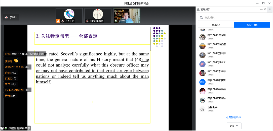 2022年12月17日晚师涛老师从写作的阅卷规则和员工作文实例出发为同学们讲解了写作提高的方法;12月18日晚张建昌老师以历年真题为例,从译文的独立可读性、全部否定句、定语从句等方面讲解了考研英语试卷中涉及的翻译策略;张梦原老师分析了近三年考研真题阅读篇章的难易程度,从中为员工梳理出难句分析、近义替换、态度判断等技巧方法。