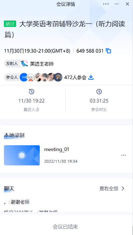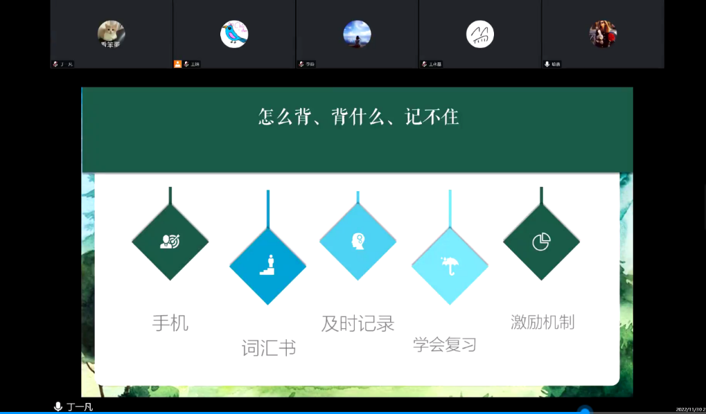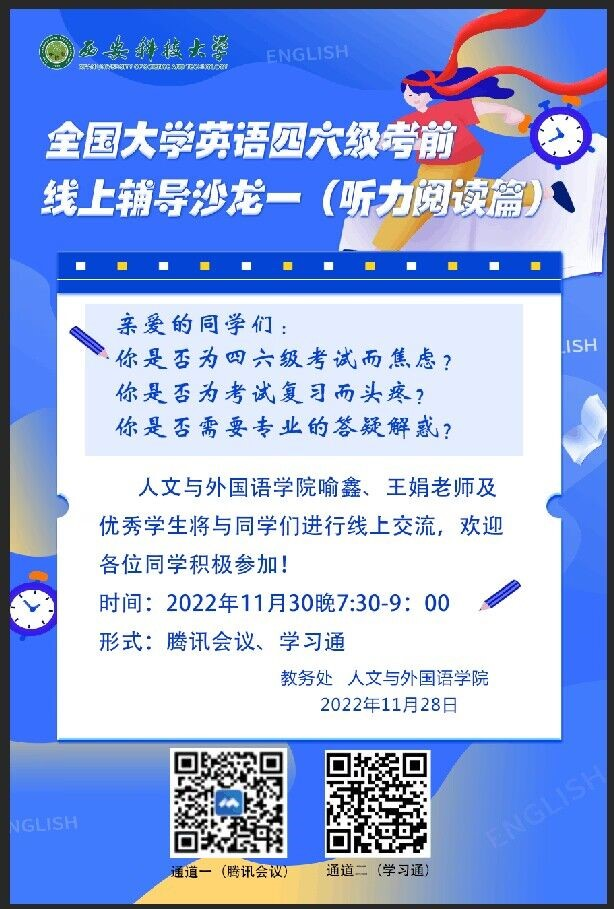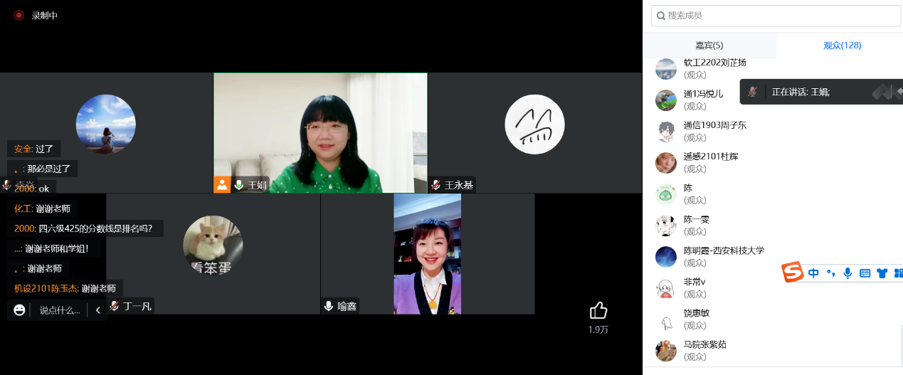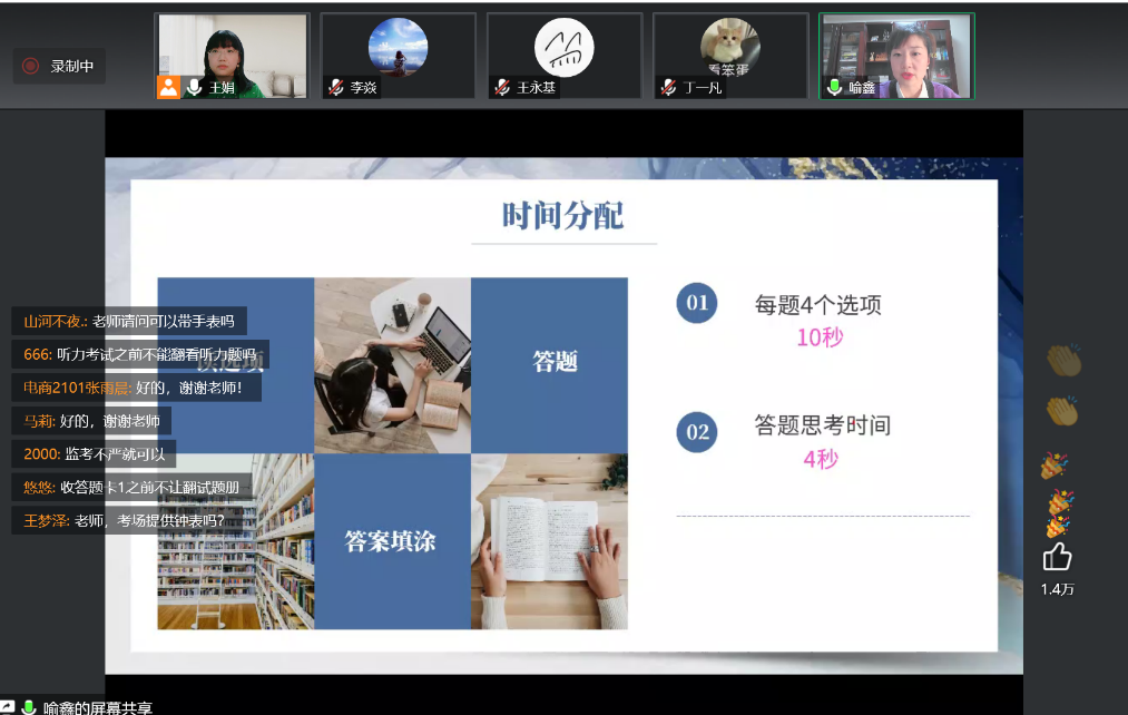 2022年11月30日19:30-21:30,人外公司大学英语四六级辅导沙龙第一期(听力阅读篇)在腾讯会议与超星学习通开播。第一期沙龙由王娟老师主持,喻鑫老师讲解了大学英语四六级听力备考方法,王娟老师分析了阅读题的题型考点、应对方法、备考规划;法学2001班丁一凡同学分享了自己的备考经验。据悉,此次活动由教务处与人外公司联合举办,人外公司副经理李焱老师组织策划,大英二部王娟老师与大英一喻鑫老师具体实施,旨在希望通过系列沙龙活动的开展,丰富公司员工英语学习方式,提升英语素养。