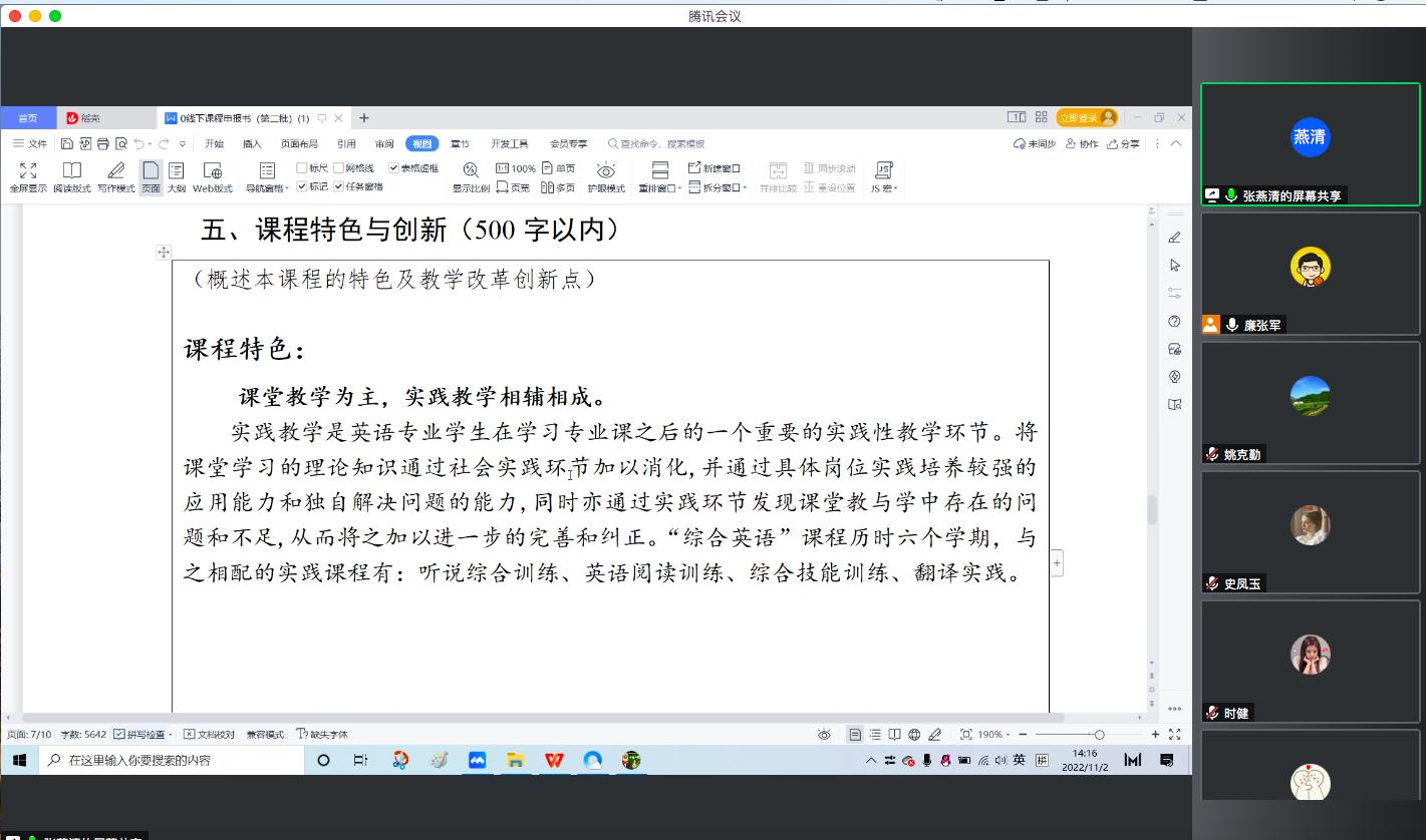 会上,张燕清教授作“综合英语—省级一流课程建设”汇报,她基于“综合英语”校级一流课程建设情况,从授课团队、课程目标、课程建设及应用情况、课程特色与创新、课程建设计划等方面分析目前该课程建设状况。穆莹副教授结合支撑材料和课程特色给予补充说明。