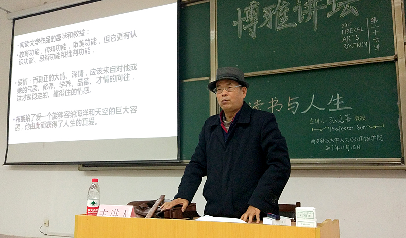 在报告中,孙见喜结合自己多年读书的体会与感受,采取讲故事、唱民歌、朗诵诗作等方式,为大家生动解读了读书的目的、方法、趣味、教益以及读书与民族精神的生成等问题,并以儒家文化结构图和中华道德发展延续图为例,提出读圣贤书是为中国伦理道德补课的观点,希望大家能够多读书、读好书、善读书,通过读书提高修养,培养独立思想和独立人格,积极为传承弘扬中华优秀传统文化、塑造以“良心(道德的自觉意识)”为基础的民族魂而尽一份力量。报告内容丰富详实,语言生动幽默,情感充沛热烈,说理深邃透彻,受到与会师生的热烈欢迎。