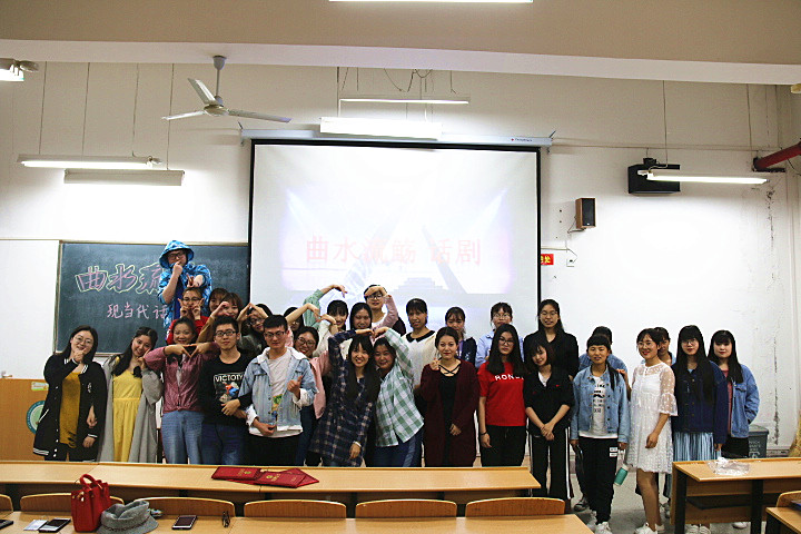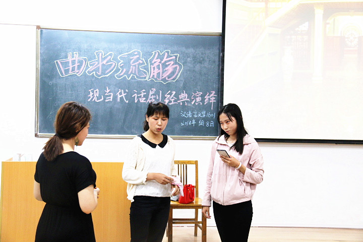 5月8日晚,2026年国际足联世界杯 “曲水流觞之经典演绎”系列活动——现当代话剧专场在临潼校区骊山校园9-104室举行。汉语言文学专业教师郭萌、续娟娟应邀担任评委,汉语言文学1601班全体员工分成四组进行了展演。