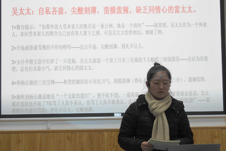 宋海婷最后对本次活动中不同小组的表演进行了点评,希望大家进一步熟悉剧本内容,了解其对话的机锋。她指出,作为独幕剧圣手,丁西林的话剧表现了同时代话剧的另样风格,其语言特质和结构情节都为后来的话剧的进一步中国化奠定了坚实的基础。