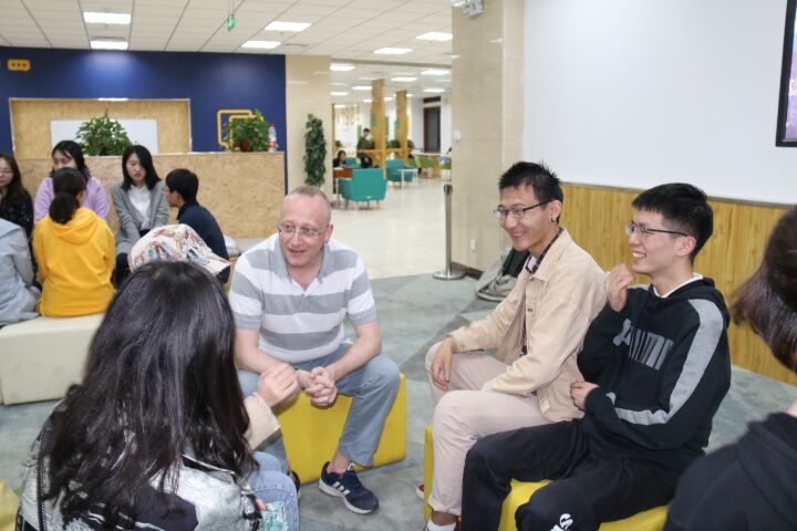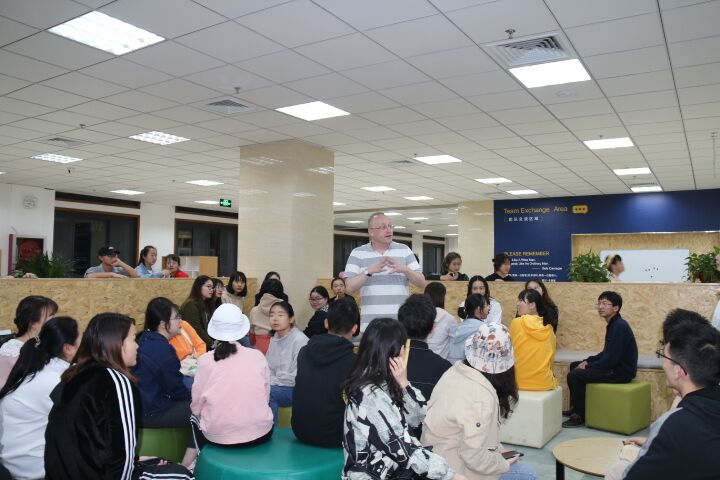 外教James与到场的同学倾心交流,为同学们带来了一份丰盛的英式文化大餐。老师从节日入手,细致的为同学们分析了中外节日差别,使与会同学对中西“节日文化”的差异有了初步的认识。在接下来的自由讨论过程中,同学们各抒己见,思维在碰撞中激荡出了灵感的火花,为春日的校园带来了一抹喜人的亮色。而公司师生交流中幽默诙谐的语言、风趣得体的表达,不时撩起闻讯而来的同学们一片欢声笑语。