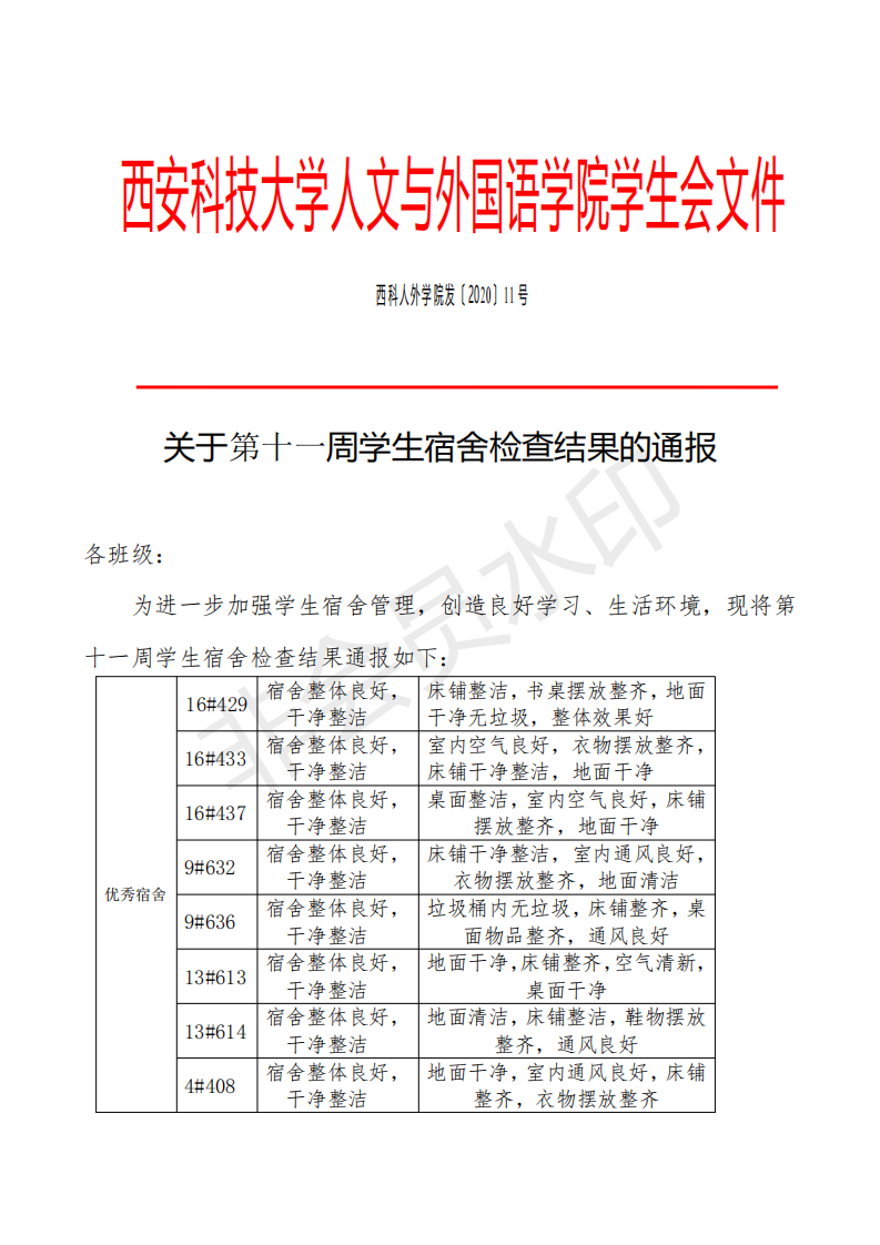 关于第十一周员工宿舍检查结果的通报
