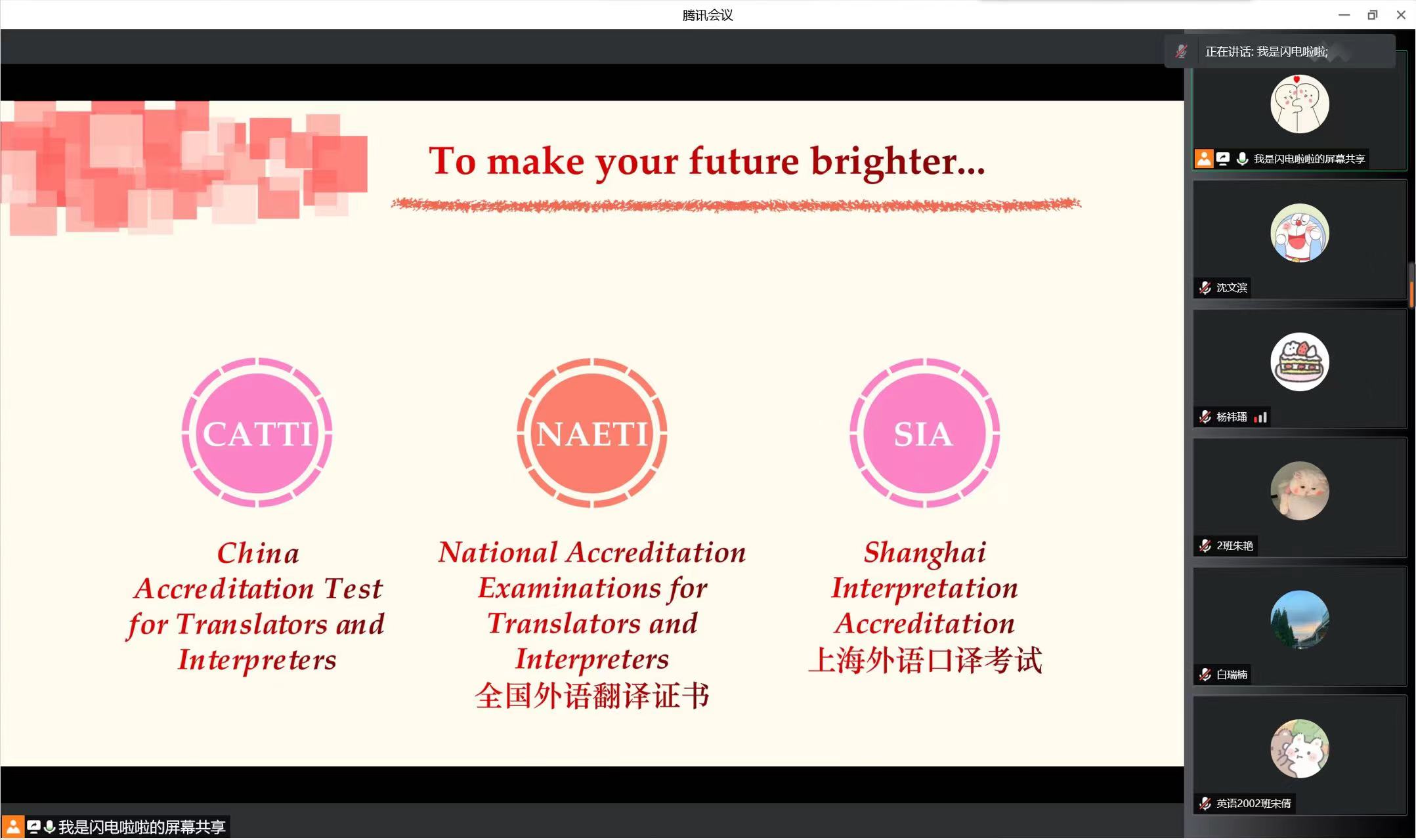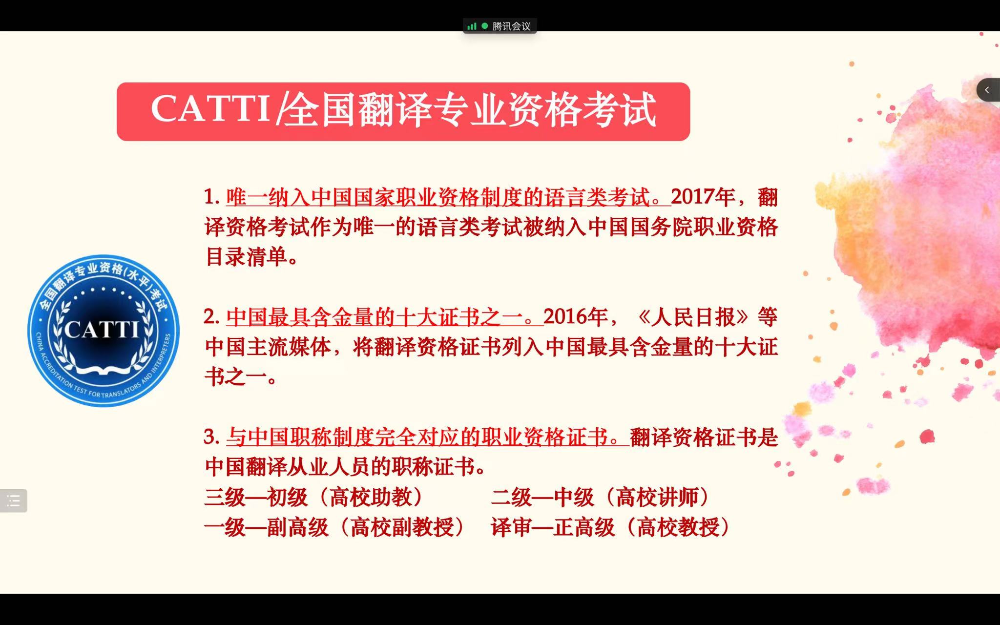 4月12日下午,2026年国际足联世界杯英语2001班举行了“CATTI介绍”主题班会。本次班会由班主任张梦原主持,英语2001班全体同学参加,受疫情影响,本次班会在线上举行。