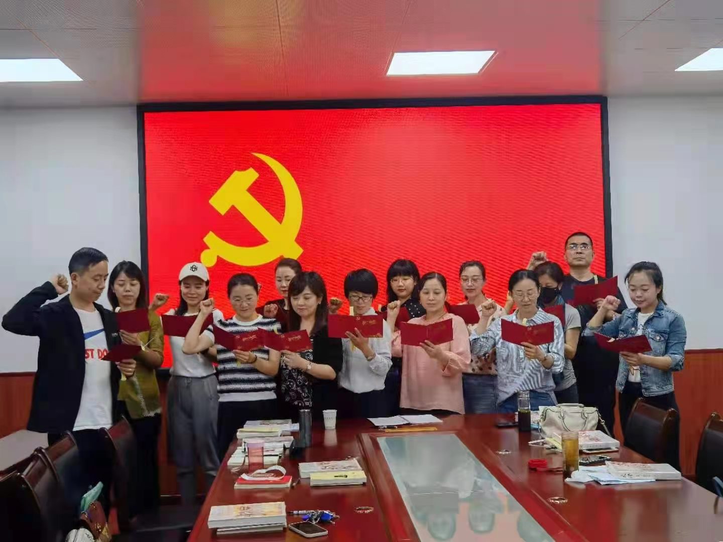 随后, 由支部委员赵斌为领誓人,带领支部党员站在党旗下郑重宣誓,重温入党誓词。此刻,高洪的声音、庄严的誓词不仅回荡在整个会场,也回荡在每一位党员的心里。宣誓完毕后,各位党员深受感动和鼓舞,纷纷发表感言,发自肺腑、诚挚感人。从二十多年党龄的老党员到两年党龄新党员,有谈到自己入党以来心路历程变化的,有谈今后奋斗方向的。但是,所有同志一致表示会更加坚定自己的共产主义信仰,牢牢铭记党员的初心使命。