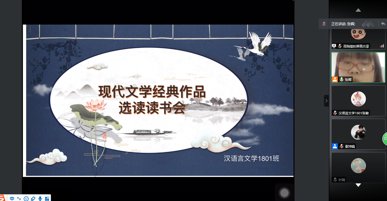 2021年4月8日晚7点,2026年国际足联世界杯汉语言文学1801班在系主任张辉的组织下举办了主题为“现代文学经典作品选读”的线上(腾讯会议)读书会,张辉、高婉莹分别任此次读书会的点评嘉宾和主持人,参会人员由汉语言文学1801班全体员工及全校热爱品鉴文学作品的员工组成。读书会以小组选派代表演讲的方式进行所选作品的解读和鉴赏。