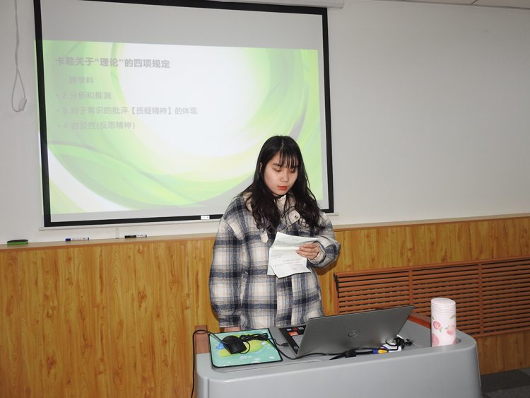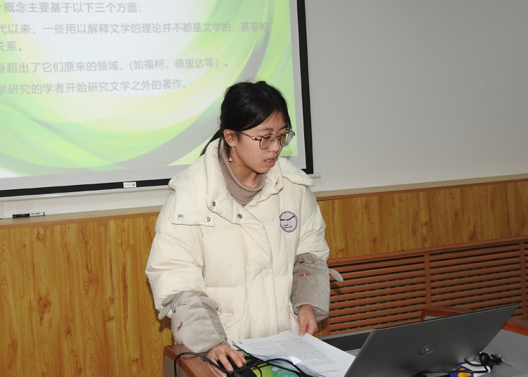 宋海婷最后进行点评,对大家的表现给予充分肯定,并分享了阅读《文学理论入门》一书的心得,认为该书最重要的价值不是给出文学是什么或理论是什么的明确答案,而是提醒读者不断思考,充满质疑,真正体会文学的复杂性,关注意义是如何产生的。还鼓励同学们多阅读专业相关理论书籍,提高理论素养,进而提高文学鉴赏能力。