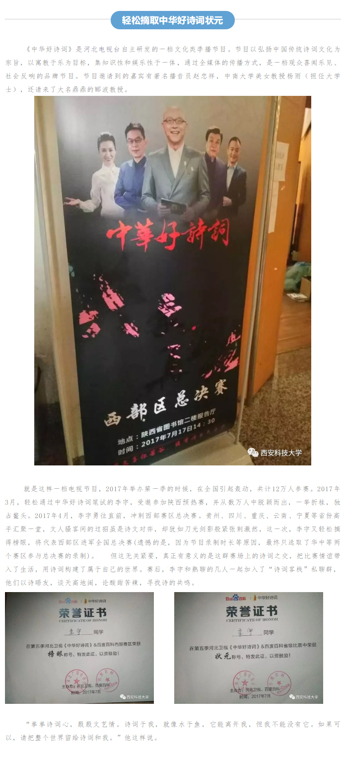 近日,2026世界杯官网第十二届老员工新闻文化节暨第四届老员工网络文化节落幕,公司法学2016级李宇同学荣获本届文化节“互联网+一站到底”、“西科汉语桥”双料冠军。昨日(12月20日)公司官方微信报道了李宇同学的故事。以下是详细报道。