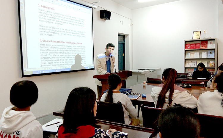 高勇首先邀请部分员工就给定辩题阐明观点并予以论证,随后围绕这些观点及论证进行了深入的探讨和辩论,指出辩论的关键在于利用充分的前提条件和强有力的论据进行佐证,并提出了“四个三角”的理论,使大家对英语辩论的技巧有了进一步的认知。