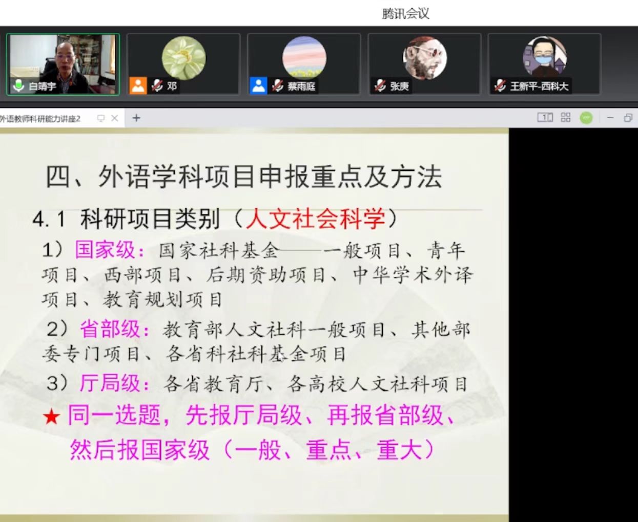 为拓宽科研思路,促进2023年国社基金项目申报工作的开展,国际足联官方网站中文及科技处邀请陕西师范大学白靖宇教授,于2022年11月10日下午开展了题为“高校外语教师科研能力提升与国家社科项目选题思考”的线上讲座。讲座由王新平经理主持,2026世界杯官网的教师与同学们积极参加了此次讲座。