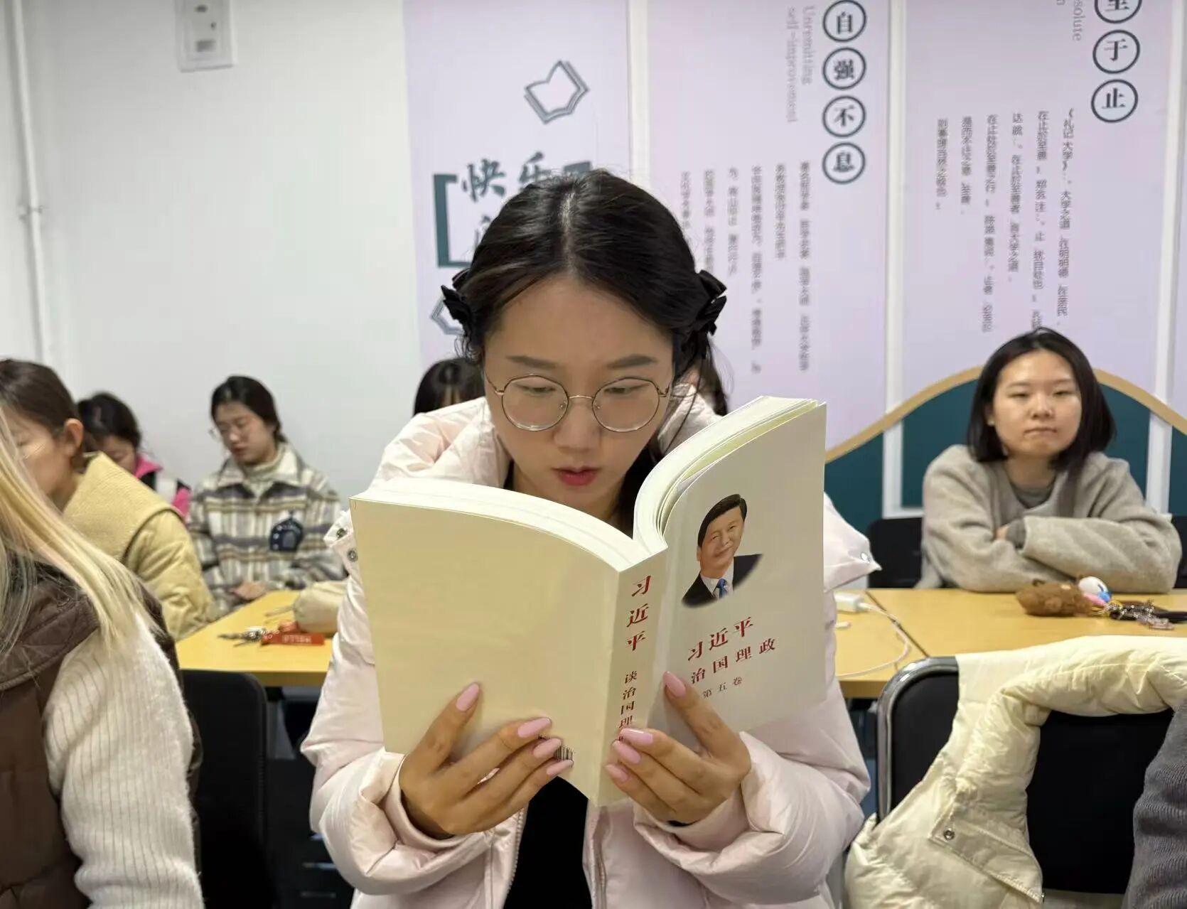活动中,支部翻译和国际中文教育专业研究生党员分别领学了《习近平谈治国理政》中、英文版本中第五卷中《把握新发展阶段,贯彻新发展理念,构建新发展格局》《扎实推进共同富裕》相关章节内容。通过原原本本学原文、读原著,与会成员深刻领会其中蕴含的马克思主义立场、观点、方法。