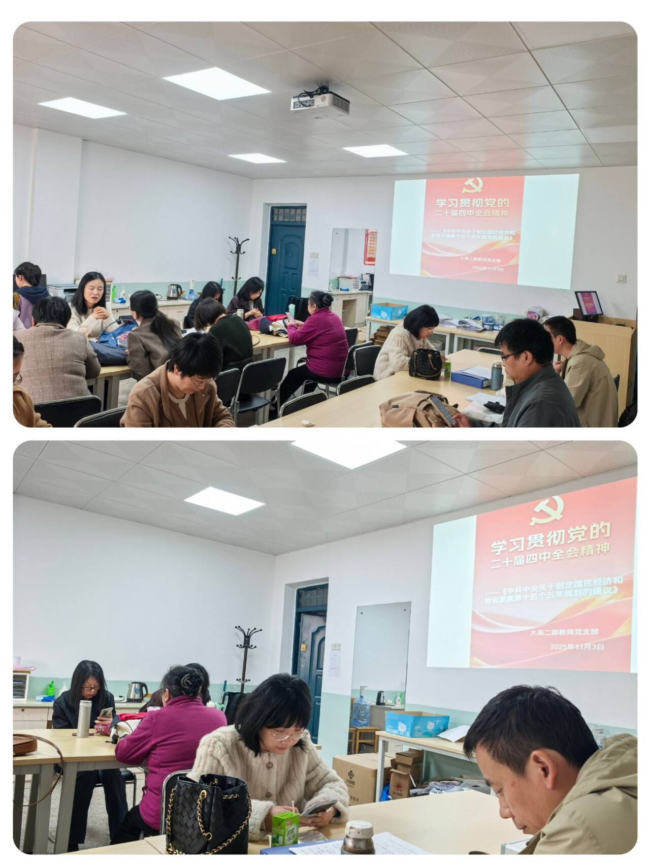2025年11月3日,大英二部组织全体党员和教师在骊山校园2-315开展年度第八次政治理论学习暨教学研讨活动,推动党建与教改科研深度融合。